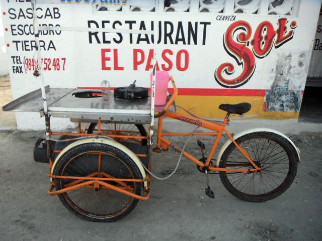 Tricyclos are a common sight in much of Yucatán Peninsula, as they are in Asia, Africa, South America and other parts of the two-thirds world. In the United States you mention a tricycle and people think of Monty Python or Laugh-In. In the global south they are multifunctional and ubiquitous. You see them as fishermen’s friends, beach-roving gear-buckets for surfers, portable crepe parlors, bellhop cabin service, and the poor man’s moving van.
