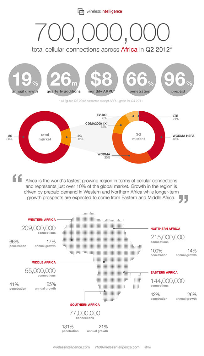 2012 Infographic on the distribution of 700 million mobile phone users across the African continent. Via.