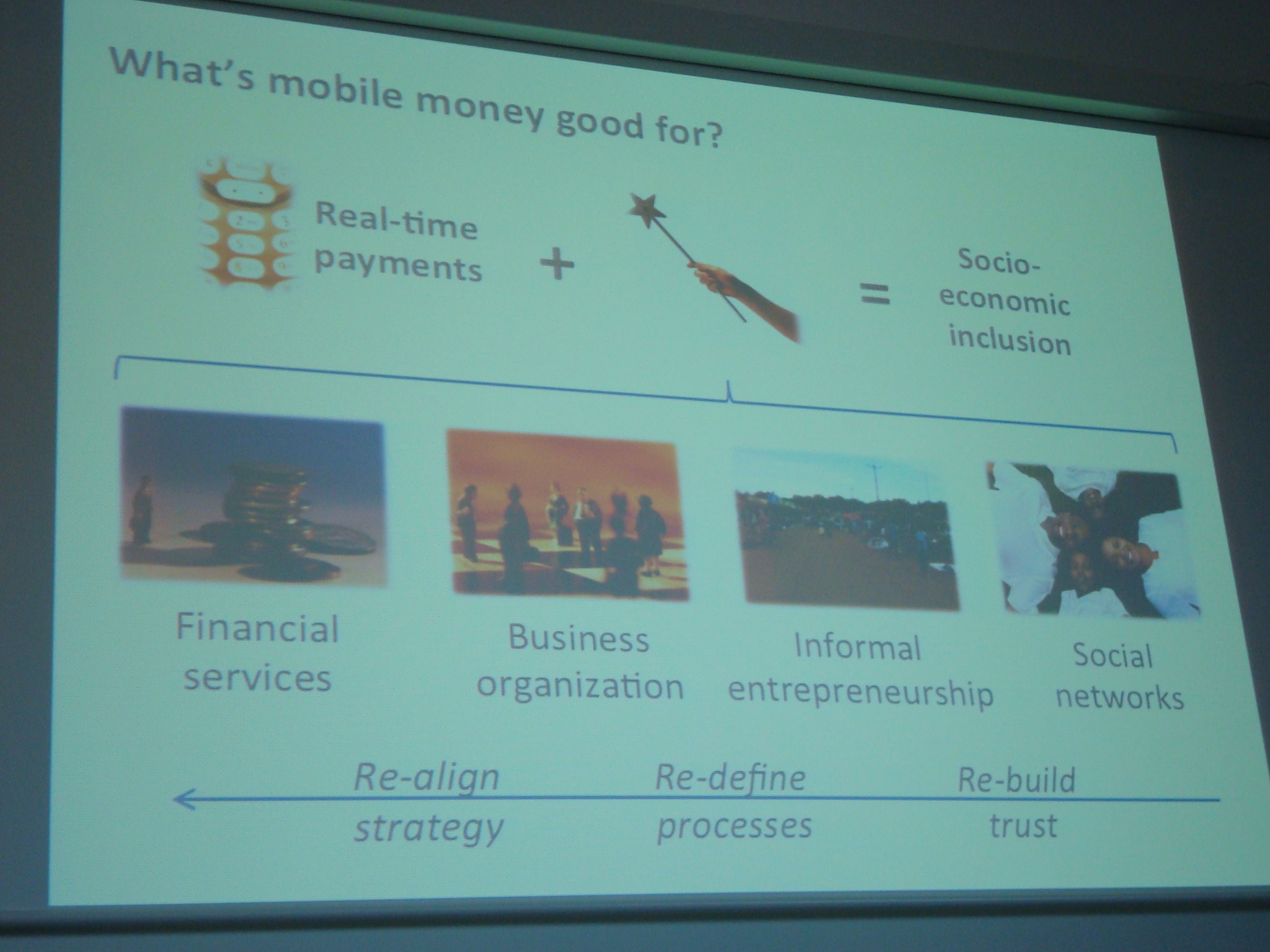 From the second panel on the future of money, I was struck by Ignacio Mas’ presentation which focused on disabusing us of the assumptions made on the role of mobile money within the informal economy and how little of a real impact it has made beyond the social network of the individual in areas such as financial inclusion or small business.