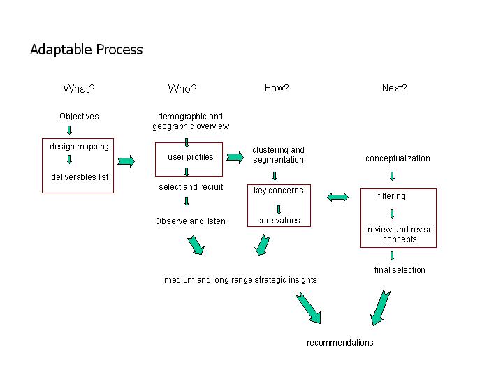 This squiggle was in response to this post of mine from August 2005, Design vs Design thinking where I’d first attempted to distinguish between the tangible role of a human centered designer and those who were inspired by the human centered design process for business strategy and planning. But, as experienced practitioners and thinkers on the messy, chaotic, non linear creativity inherent in these activities will recognize immediately, the squiggle is too implicit to help communicate the process with clarity to audiences without exposure to the process, such as your typical client organization or institution. Linear, structured thinkers need to feel confident they understand what you are planning to do and how you’ll go about it before they’ll sign a check.