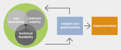 But those of you familiar with the application in the practice of user centred design will recognize that this section applies to the design planning phase, prior to the design and development of the first prototype, boxed up here as “implementation”. You’ll also note that “User research” or rather, “Immersion” in the field, is left implicit, although one can say that it is represented by the green circle. Exploring as I was, back then, the intersection of where design met business, I felt this diagram was limited in its ability to communicate what really happened, much less why or how.