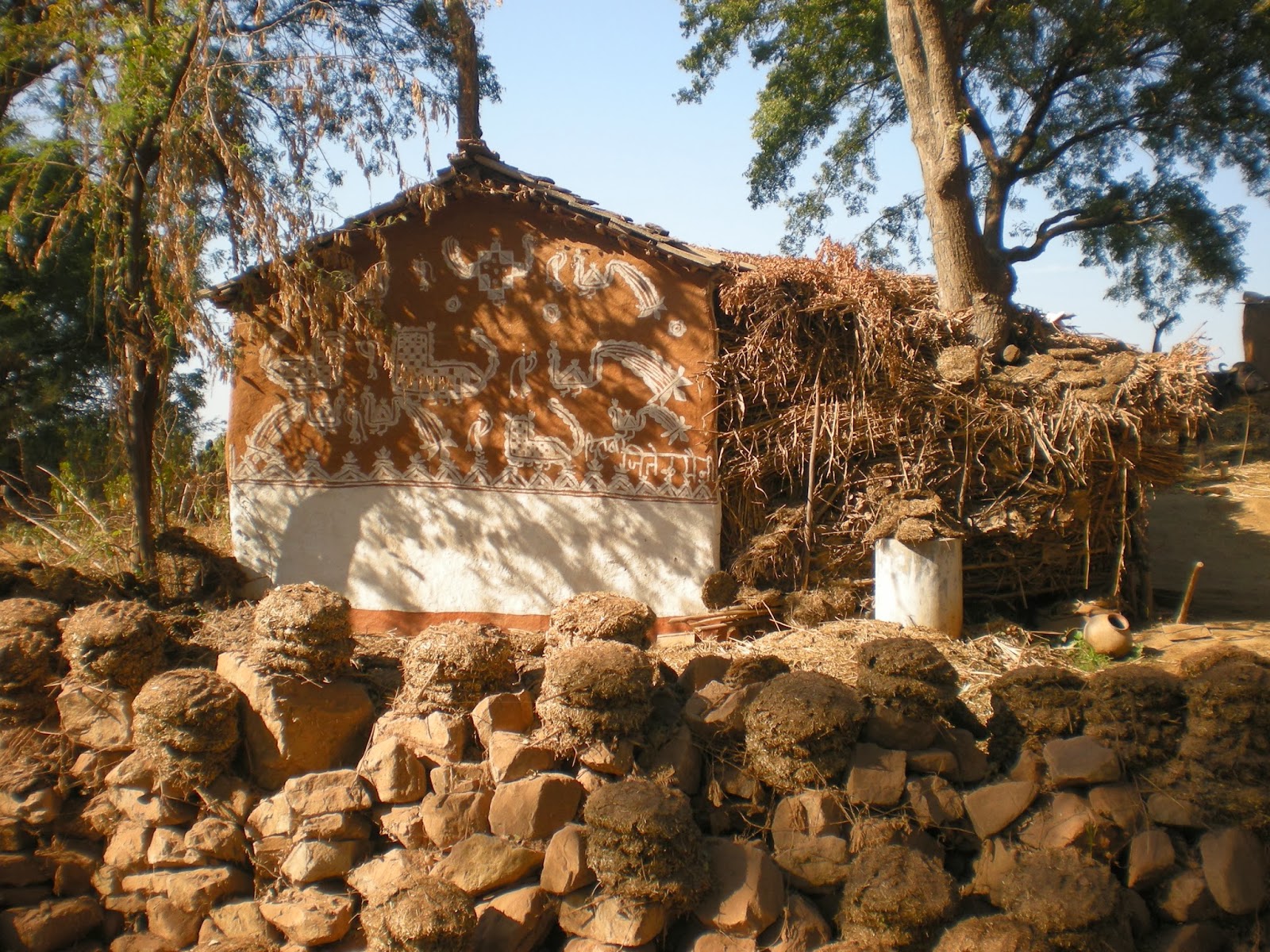 The walls are plastered with a mixture of cow dung and mud before the womenfolk decorate with traditional designs. Dung is considered a purifier and has myriads of uses. This household clearly sends a signal of its status in the village and its ownership of a producer of fuel, food and fertilizer.