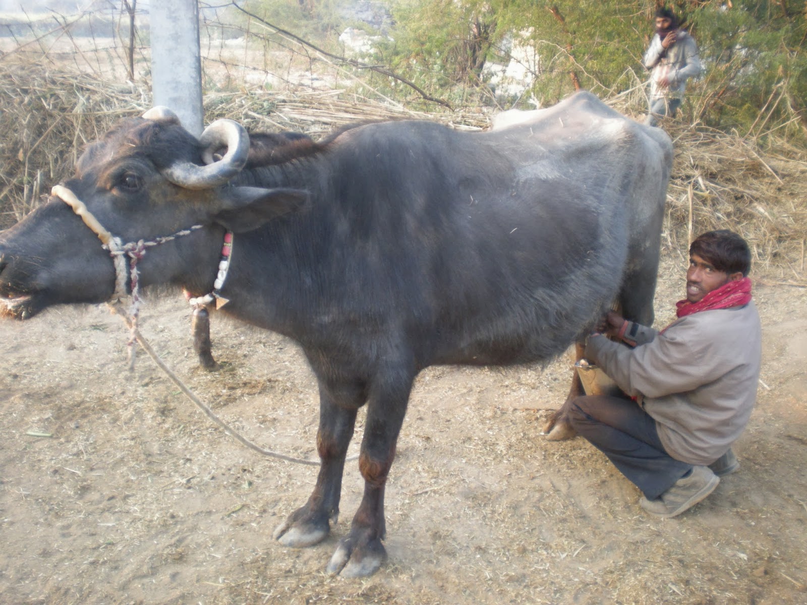 Even if the women in the household may not be able to afford a cow or it may be considered a man’s possession, she usually has a nanny goat or two for milk in the morning. When there is no access to the electric grid, nor home appliances to preserve it for longer than a day, then the best way to access fresh milk for the morning cuppa is directly from the udder. With larger livestock such as a buffalo or cow, the quantity maybe sufficient for cash sale to the ubiquitious chaiwallah if noone else. Milk and milk products such as yoghurt and cottage cheese (paneer) are a part of the Indian vegetarian diet. Sales provide an avenue for cash money, necessary to the most self sufficient farm, such as for mobile airtime or salt, oil and tea leaves.